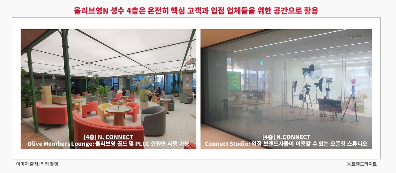 또한 매장 내 공간과 상품 구성을 조금 더 자세히 살펴보면, 올리브영이 앞으로 나아가고자 하는 방향이 더 명확하게 드러납니다. 우선, 4층 전체를 VIP 고객과 입점사를 위한 공간으로 할애했다는 점에서, 올리브영이 이들과의 관계를 더 깊이 중요시하고 있다는 의지가 엿보입니다.