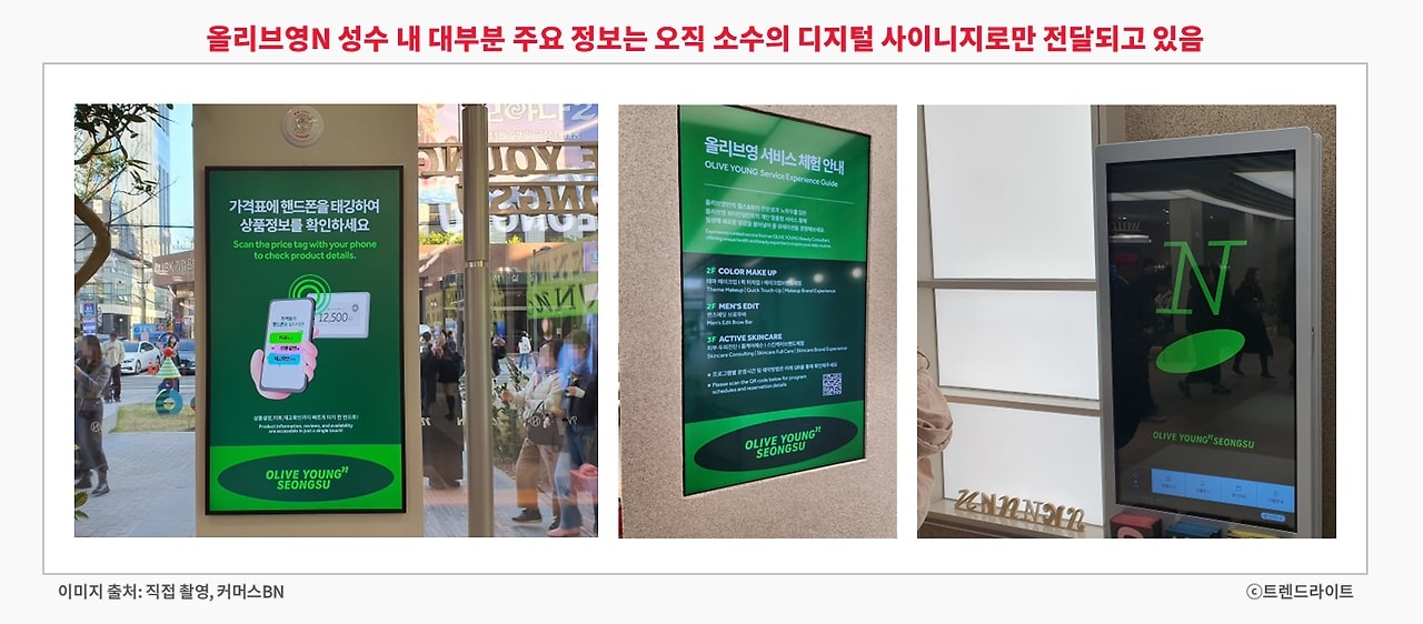 이렇게 장점과 아쉬움이 공존했던 올리브영N 성수의 첫 주말 성적은 어땠을까요? 올리브영 측에 직접 문의했지만, 매출은 공개하기 어렵다는 답변을 받았습니다. 조심스럽게 추정해 보자면, 매출 규모가 홍보할 만큼 만족스럽지 않았던 것으로 보입니다. 그러나 올리브영N 성수의 방향성이 매출보다는 고객 경험에 초점을 맞추고 있다는 점을 고려하면 이는 어쩌면 당연한 결과일지도 모릅니다. 커뮤니티 등을 통해 확인한 고객들의 반응은 긍정적인 편이었고요.또한 올리브영N 성수가 성수에 집중한 이유 중 하나였던 글로벌 확장 측면에서도 초기 성과는 나쁘지 않습니다. 올리브영 관계자에 따르면 외국인 매출 비중이 60%에 달했으며, 매장을 돌아다니면서도 관광객들의 모습을 자주 볼 수 있었습니다. 다만, 외국인 고객을 위한 특화 콘텐츠는 앞으로 더 보강할 필요가 있어 보였습니다.