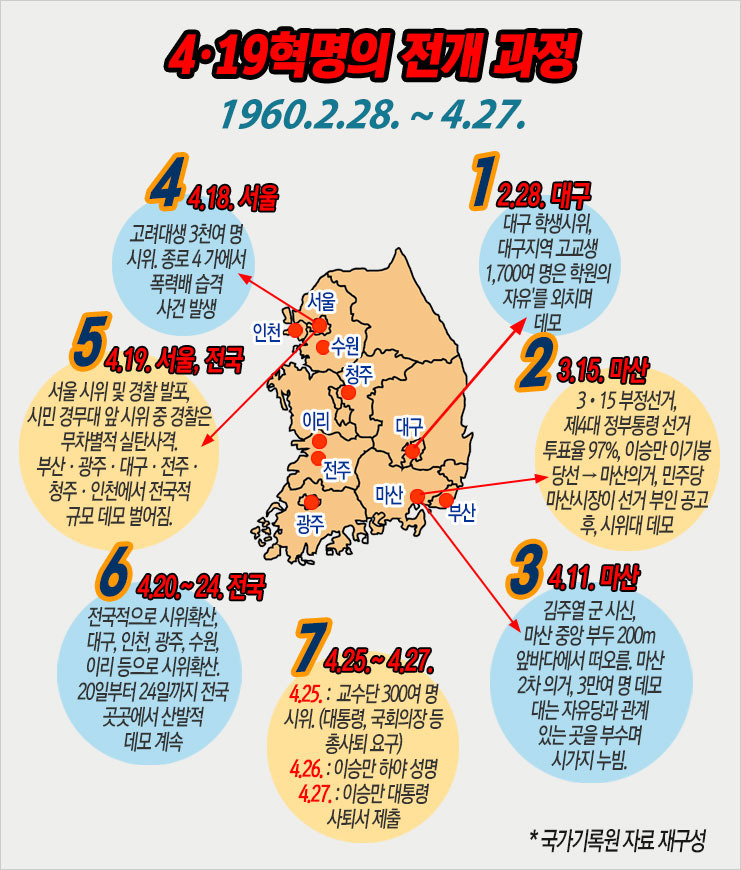4월 19일의 시위와 항거는 2·28이래 이어져 온 일련의 저항을 매듭짓는 항거의 정점이었다. 혁명의 불길이 걷잡을 수 없이 번지자, 자유당 정권은 사건 무마에 온 힘을 기울였지만, 민심은 근본적인 개혁을 요구하기 시작하였다.