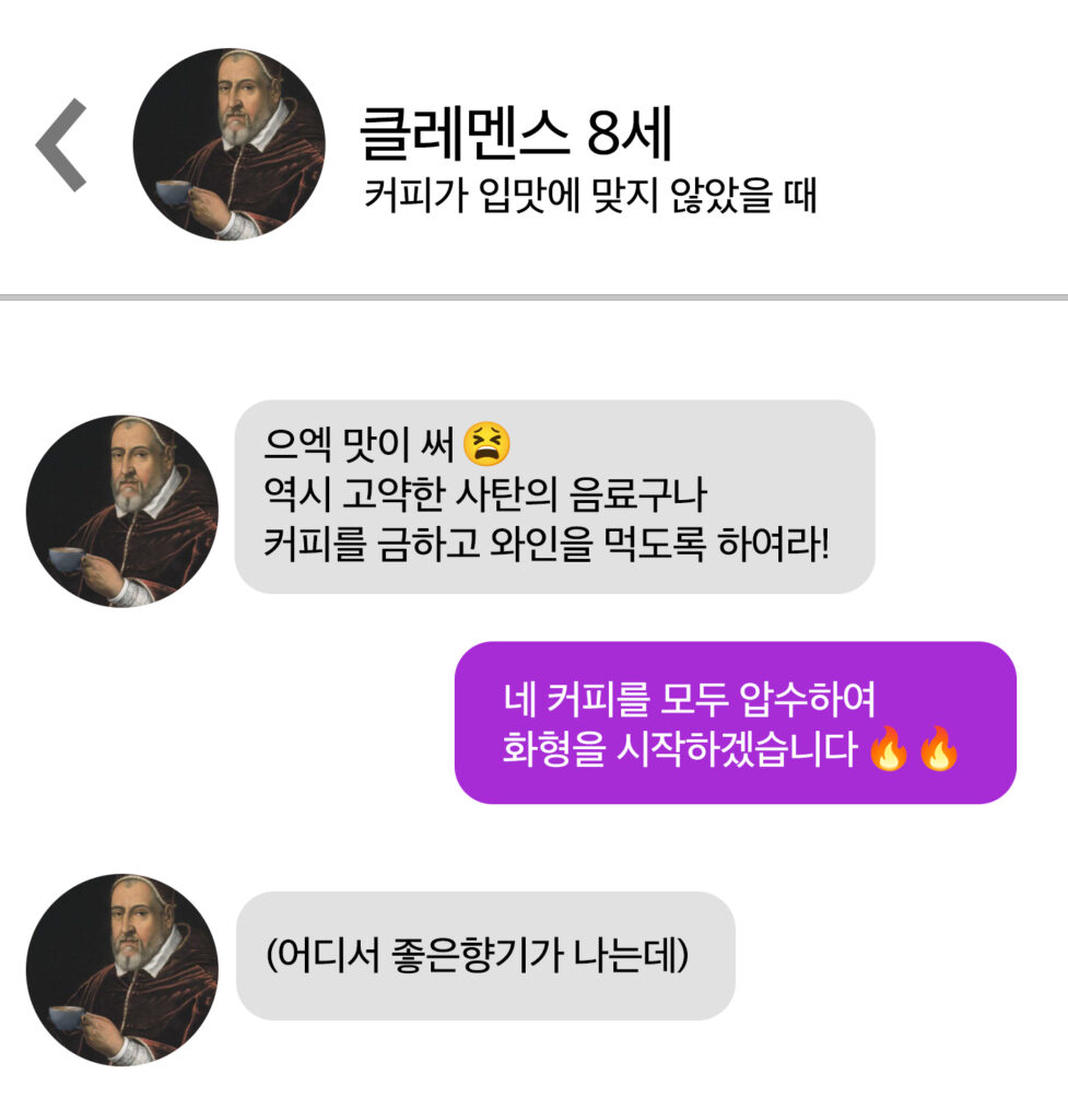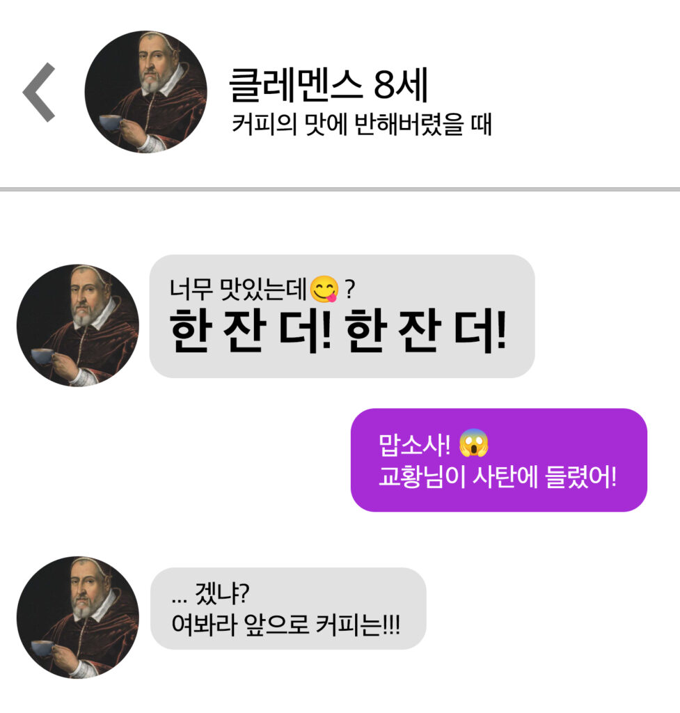 그리고 당시 교황이었던 ‘클레멘스 8세’는 말한다. 커피의 맛을 보고 결정하겠다고. 이 결정에 따라 유럽에서 커피, 더 나아가 전 세계의 운명이 결정되는 것이다. 과연 그는 커피의 맛을 보고 어떤 말을 했을까?
