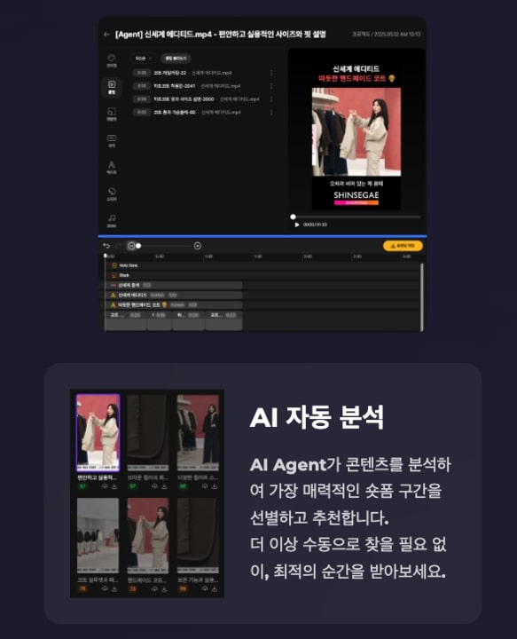 이승환: 계속해서 다른 커머스 AI 솔루션도 소개해 주시죠.남상협: ‘숏폼AI’와 ‘리뷰AI’가 있어요. 먼저 ‘숏폼AI’를 설명 드리면요. 저희가 ‘홈쇼핑모아’를 운영했잖아요. 홈쇼핑은 영상을 기반으로 판매하잖아요. 그래서 저희는 어떤 제품의 어떤 영상이 나올 때 구매가 많이 이뤄지는지, 10년 간 데이터가 쌓여 있어요. 그래서 ‘홈쇼핑모아’에 입점한 홈쇼핑사를 대상으로 ‘가장 중요한 영상’을 자동으로 잘라주는 기능을 만들었어요.