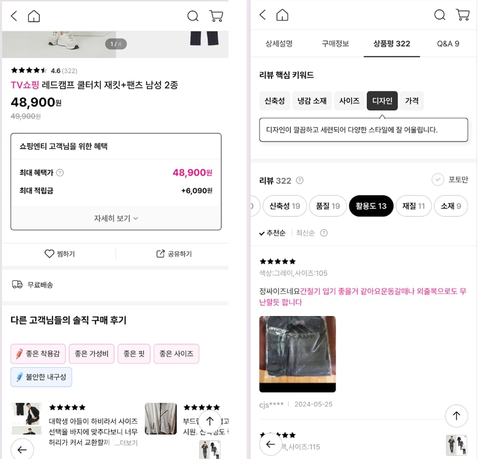 남상협: 리뷰 라는게 결국 ‘고객’을 위해 있는 거잖아요. 즉 사람들이 원하는 정보를 주는 건데, 모든 리뷰를 분석해서 AI가 대표적인 리뷰를 자동 생성해 주는 거죠. 여러 리뷰를 뒤지지 않아도 ‘아, 이런 제품이구나’를 알 수 있도록요. 또 좀 더 세부적으로 알 수 있도록, 만족도, 사이즈, 가성비 등 다양한 키워드와 표현으로 추려 볼 수도 있습니다. 그 키워드만 클릭하면, 이 제품의 내 관심 있는 속성이 어떤지 빠르게 볼 수 있죠.