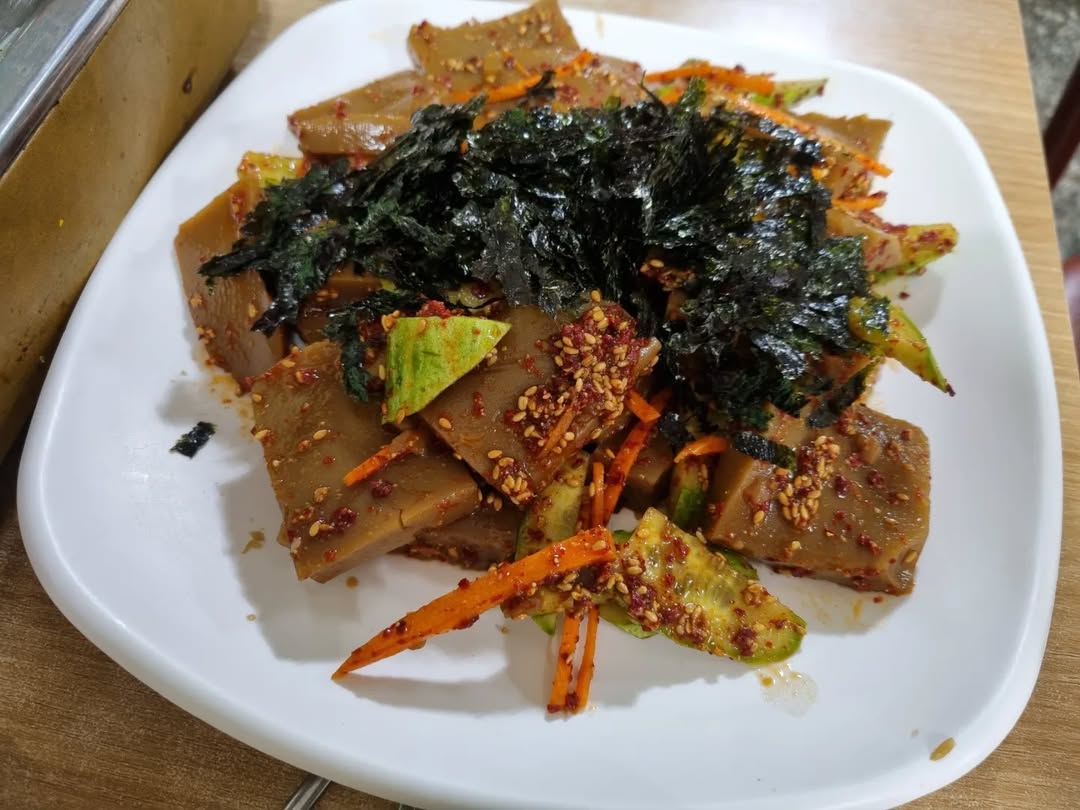 콩국수 먹을 때 빠질 수 없는 김치는 1인 1접시로 제공되어 위생적이며, 시원하고 아삭해 콩국수와 잘 어울린다. 사이드로는 바삭바삭하게 지져낸 김치전을 추천한다.