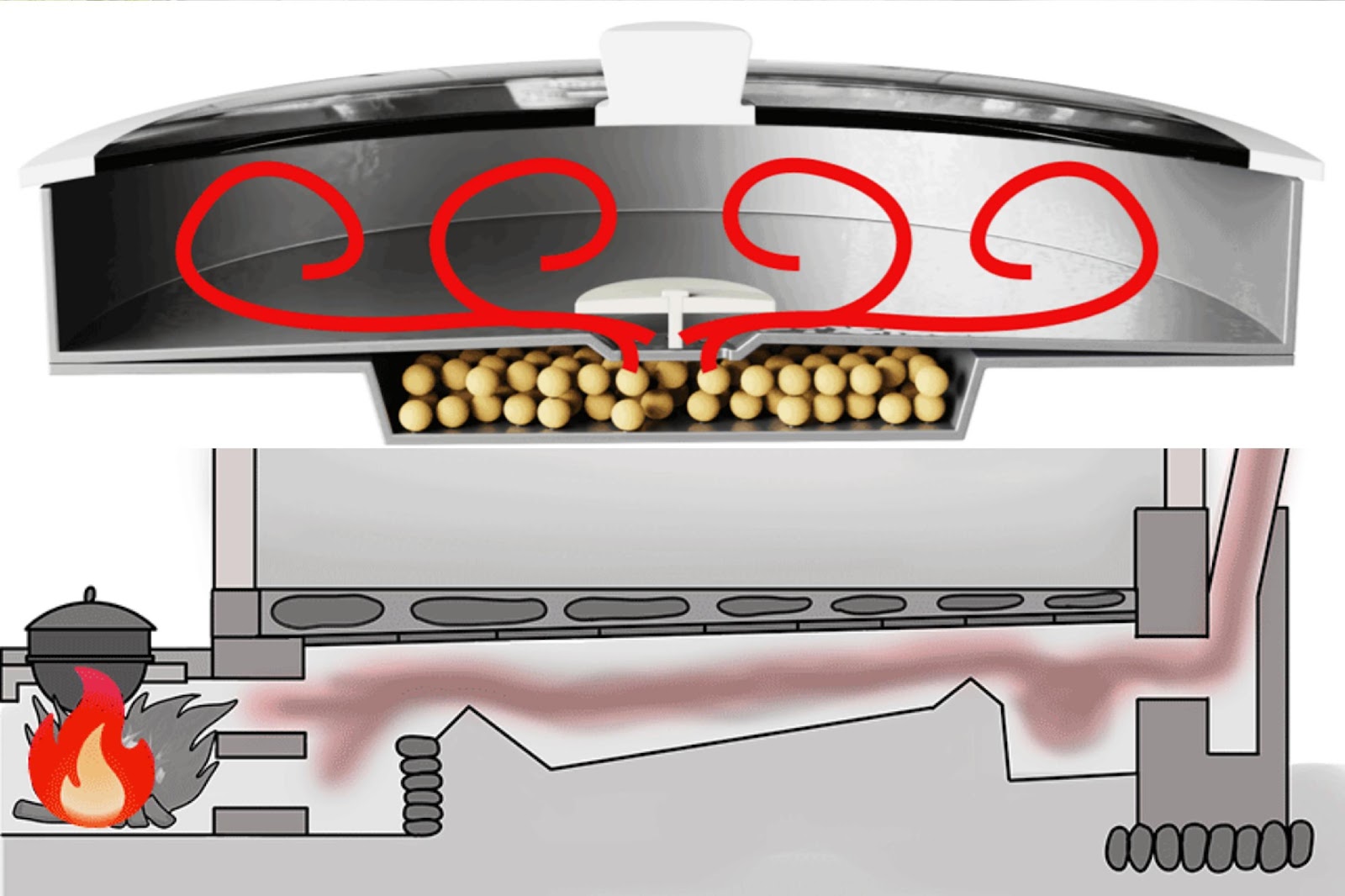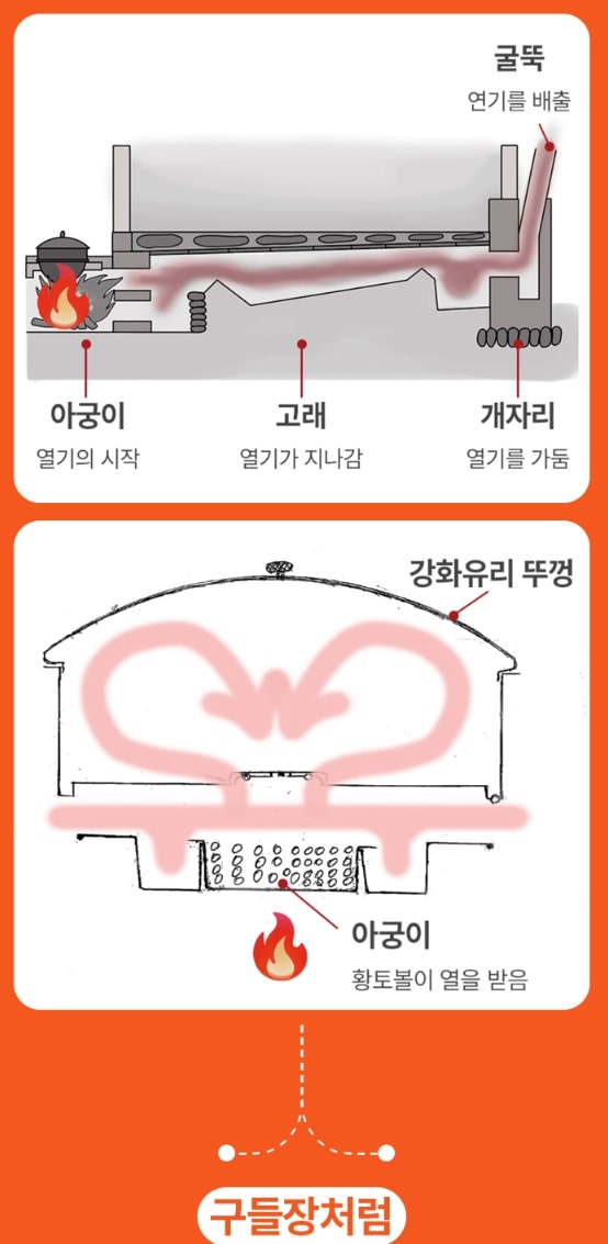 이승환: 맛있는 원리를 좀 구체적으로 풀어주신다면?손병호: 아까 이중 구조라고 말씀드렸잖아요. 상부가 구들판이고 하부가 아궁이에요. 먼저 아궁이에 불을 붙이면 그 안에 있는 황토볼들이 열기를 머금습니다. 그 열이 구들판의 중앙에 뚫려있는 작은 열기 유입부들을 통해 위로 퍼져나가요. 그렇게 올라온 열기가 위에 덮인 뚜껑에 막혀서 열기가 오븐처럼 대류하는 원리인 거죠.