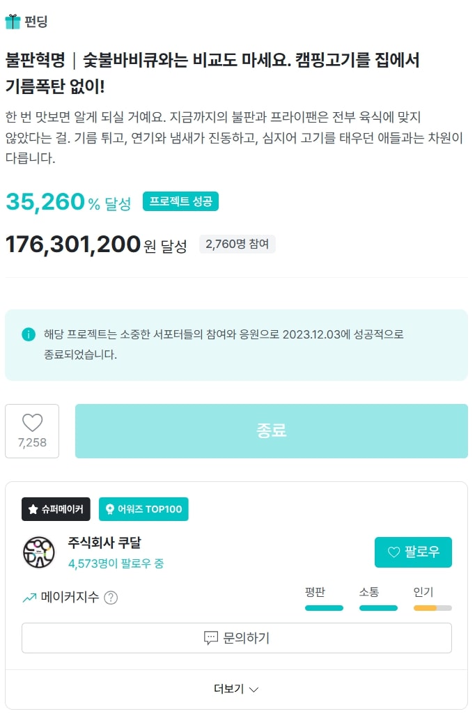 이승환: 실제로 판매도 잘 됐나요?손병호: 저도 많이 놀랐습니다. 와디즈 1차 오픈으로만 1억 7천 넘게 팔았어요. 와디즈 불판 카테고리 역사상 압도적인 1위 기록을 세워버렸죠. 그 뒤로 3차례 걸쳐 펀딩을 했는데 총 3억 넘게 팔렸고요. 반응도 굉장히 좋아요. 현재 카카오와 쿠팡, 양쪽 모두 고객만족도가 97%예요.