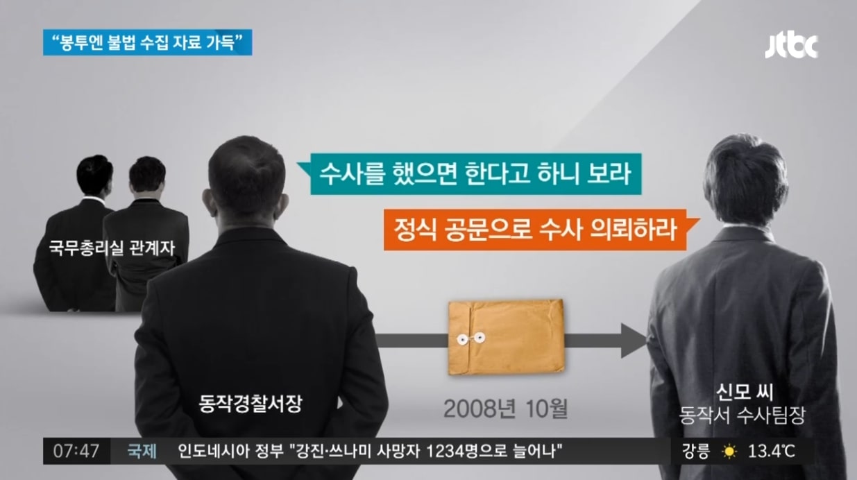 이승환: …손병호: 이래가지고 거의 한 달 동안 수사 안 했어요. 그러니까 총리실에서 전화 와가지고 팀장님한테 쌍욕하고 그랬죠. 그렇게 총리실로부터 정식으로 수사 의뢰 공문을 받기로 하고 어찌저찌 수사는 하게 됐는데 일체 혐의 없다고 내사 종결했어요. 그러니까 또 총리실에서 팀장님이랑 저를 좌파 경찰이다 뭐다 하며, 내사 종결된 걸 살려서 검찰에 송치하고…