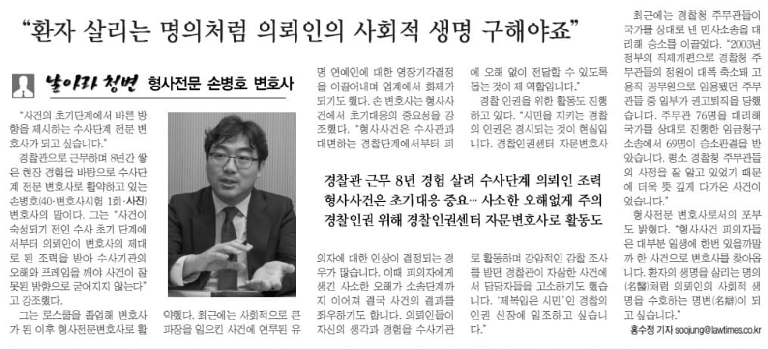 이승환: 근데 경찰대 갔다가 로스쿨은 어쩌다 가셨어요?손병호: 원래 제 꿈은 인터폴에 가서 ‘경찰 영사’가 되는 거였어요. 일종의 경찰 외교관이죠. 그래서 경찰 생활하면서도, 서울대 국제대학원 석사도 했어요. 근데 경찰청 외사국으로 발령 나기 전날, 갑자기 밤에 연락이 와서 내정이 취소되고 뒤바뀌었다는 거예요. 나중에 알아보니 빽에 밀렸다는 거예요. 그때 되게 큰 실망을 했죠.