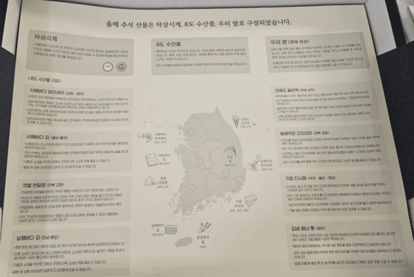 ‘8도 수산물’은 미래를 향한 비전을 담았다. 인천의 보리새우, 충남의 김, 전남의 김, 제주의 톳, 부산의 다시마, 경북의 건오징어, 강원의 돌미역 등 전국 각지의 바다 특산물을 한데 모은 것은 기계적인 지역 구색 맞추기를 넘어선다. ‘북극항로 시대’라는 새로운 기회의 바다를 맞아, 삼면의 바다를 토대로 ‘세계로 뻗어가는 진짜 대한민국’을 만들겠다는 해양 국가로서의 포부와 미래 전략을 상징한다.