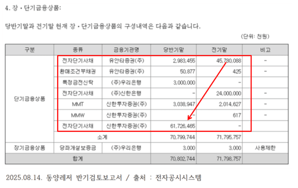 그러나 2025년 상반기 반기보고서(8월 14일자)에는 유안타증권 예치금이 약 29억 원(2,983,455천 원) 수준으로 급감한 반면, 신한투자증권 상품(MMT·전자단기사채 등)이 640억 원 이상으로 대체됐다.
