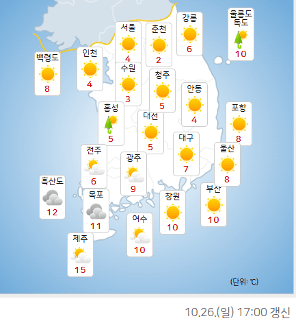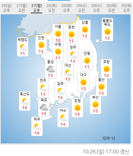 찬 공기가 남하함에 따라 내일(27일)과 모레(28일) 아침에는 전국 대부분 지역의 기온이 평년보다 낮아질 전망이다. 내일 아침 최저 기온은 -2도~11도, 낮 최고 기온은 9도~16도로 예보됐다. 특히 일부 내륙은 오늘보다 아침 기온이 더욱 떨어지며, 모레(28일)도 -3도~8도까지 기온이 내려가겠다.