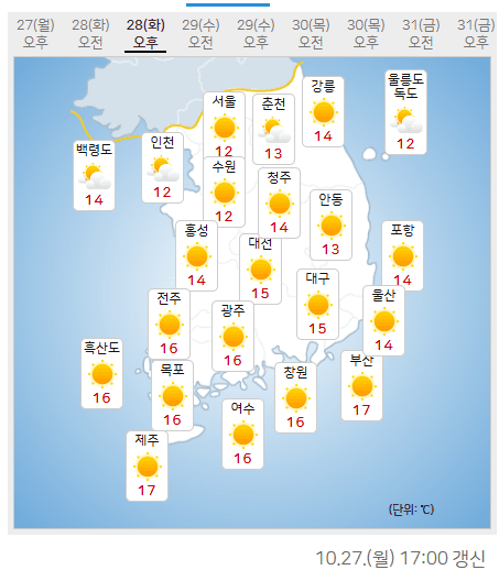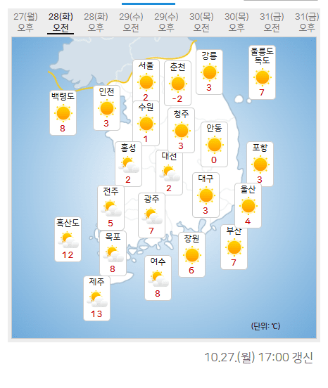 북쪽에서 찬 공기가 내려오면서 내일(28일)부터 모레(29일) 아침까지 전국 대부분 지역의 기온이 큰 폭으로 떨어질 전망이다.