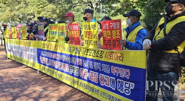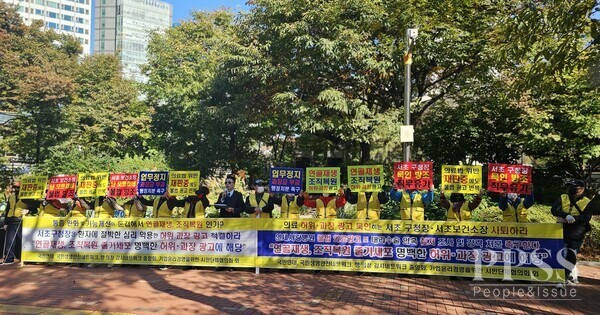 27일 오후 서울 서초구 서초보건소 앞에서 국민연대, 국민생명안전네트워크, 행·의정감시네트워크중앙회, 기업윤리경영을위한시민협의회 등 시민단체 관계자들이 기자회견을 열고 연세사랑병원의 ‘연골 재생’ 허위 의료광고와 대리수술 의혹에 대한 철저한 조사를 촉구하고 있다.