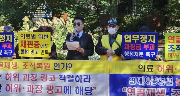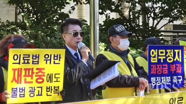 행·의정감시네트워크중앙회 김선홍 중앙회장이 “이미 의료법 위반으로 재판 중인 병원이 또다시 불법 광고를 반복하고 있다”며 “서초보건소가 아무런 조치를 하지 않는 것은 명백한 직무유기”라고 발언하고 있다.