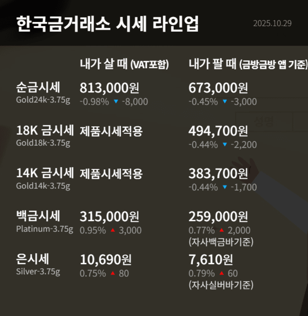 국제 금값은 지난 20일 고점 대비 10%가량 하락하며 조정 국면에 진입한 모습이다. 온스당 4천 달러 선을 유지하던 금 현물 가격은 28일(현지시간) 기준 3,898달러(약 558만원)를 기록하며 지속적으로 하락세를 이어가고 있다. 이를 환산하면 1그램당 약 180,000원, 1돈(3.75g)당 약 676,000원 수준이다.