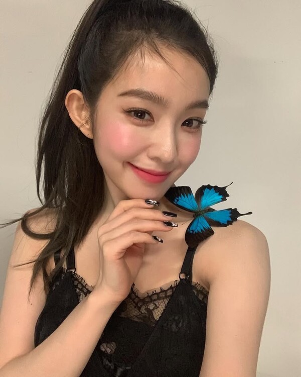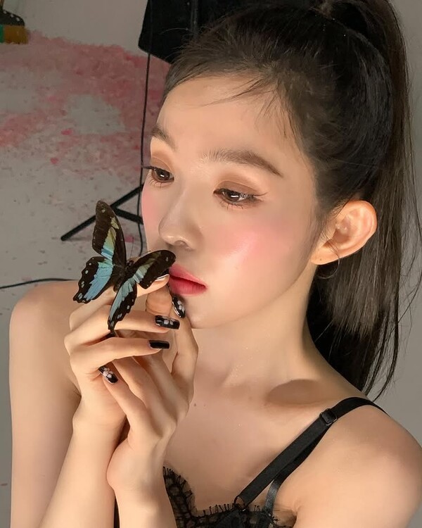 사진 속 아이린은 손에 나비를 조심스레 얹은 채 차분한 분위기를 자아냈으며, 단색 배경과 핑크빛 꽃잎이 어우러진 공간은 로맨틱하면서도 몽환적인 무드를 완성했다. 입술을 다문 채 정면을 응시하는 깊은 눈빛도 시선을 사로잡았다.