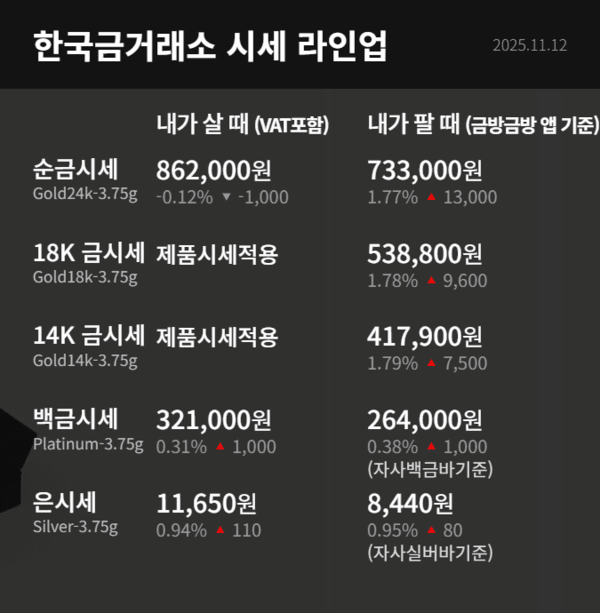 12일 기준 국내 금 시세는 1돈(3.75g)당 구매가 86만2천원, 판매가는 73만3천원이며, 같은 날(현지시간) 국제 금 현물 가격은 온스당 4,111달러 선에서 거래되고 있다.