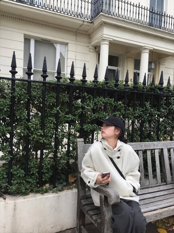 다른 사진에서도 하이넥 아우터에 대한 선호가 드러났다. 크림톤의 하이넥 코트에 모자와 가방을 비슷한 색상으로 매치하며 통일감 있는 패션 감각을 보여줬다.
