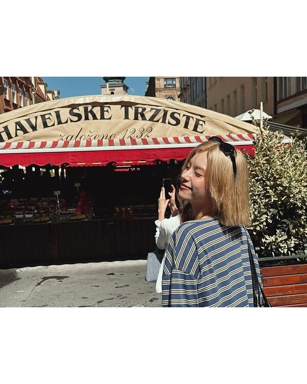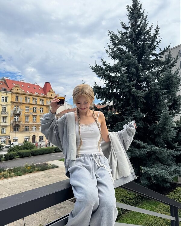 예지는 12일 자신의 SNS를 통해 회색 후드티와 회색 트레이닝 바지로 구성된 캐주얼한 트레이닝 셋업 차림의 사진을 공개했다. 무늬가 있는 벽 앞에서 거울을 바라보며 셀카를 찍는 모습과, 푸른 하늘과 나무가 보이는 야외 벤치에 앉아 음료수를 들고 여유를 즐기는 장면 등이 담겼다.