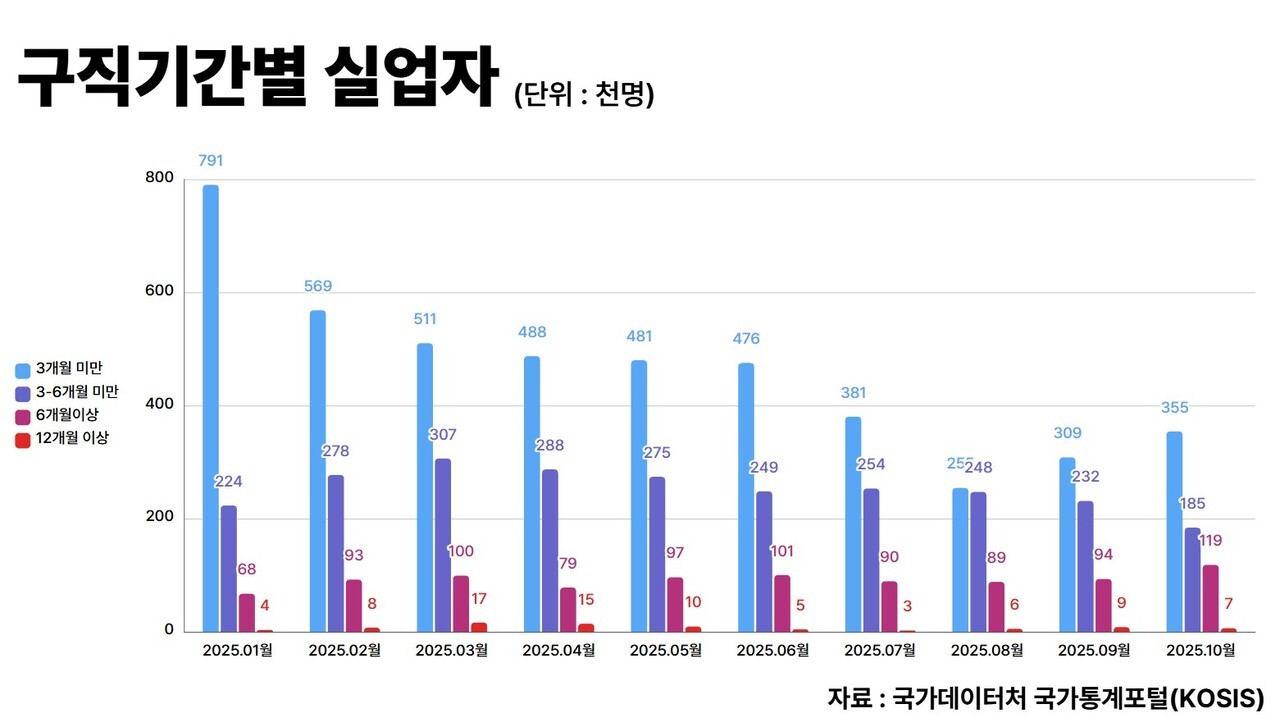 17일 국가데이터처 국가통계포털에 따르면 지난 10월 기준 구직 기간이 6개월 이상인 장기 실업자는 11만9000명으로 집계됐다. 2021년 10월 12만8000명을 기록한 이후 4년 만에 가장 많은 수치다.