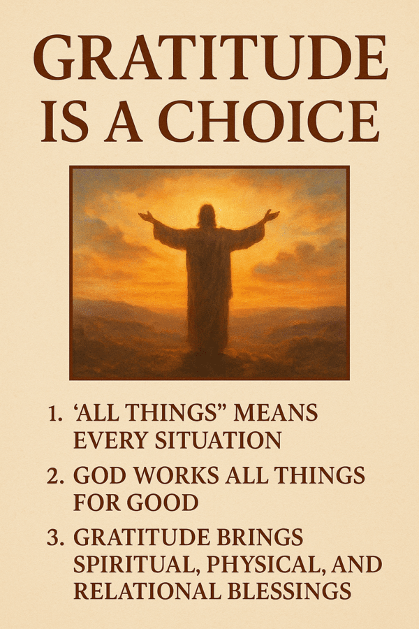 사도 바울은 “범사에 감사하라” 가르칩니다. “범사”란 모든 상황과 환경에서라는 의미이다. 좋은 일이든 나쁜 일이든, 순경이든 역경이든, 언제 어디서나 감사하라는 말입니다. 성공하였을 때나 실패하였을 때나. 높아졌을 때나 낮아졌을 때나, 부자일 때나 가난할 때나, 건강할 때나 병들었을 때나 항상 감사하라는 말입니다. 좋은 일이나 순경에 처할 때는 감사하기 쉬우나 나쁜 일이나 역경에 처할 때는 감사하기란 대단히 어려운 일입니다.