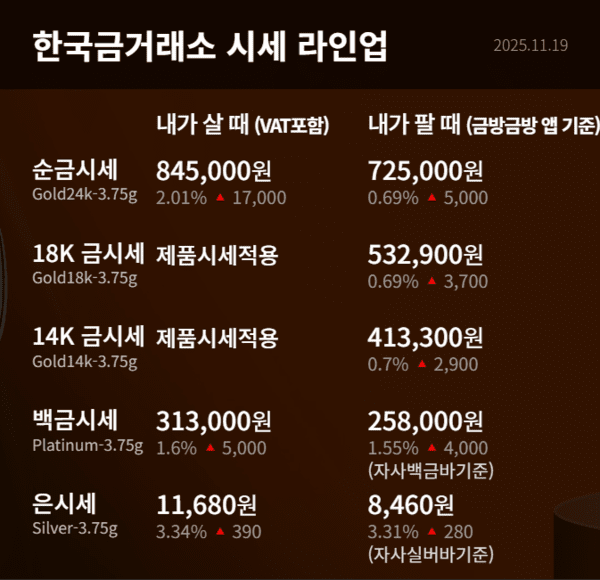 2025년 11월 19일 한국금거래소 시세에 따르면, 순금(24K, 3.75g)의 살 때 가격은 전일 대비 2.01%(17,000원) 오른 84만 5,000원으로 나타났다. 팔 때 가격은 72만 5,000원으로 0.69%(5,000원) 상승해 최근의 금값 강세 흐름을 반영하고 있다.