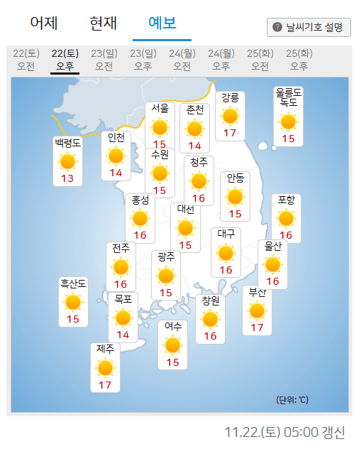오늘 전국의 낮 최고기온은 13도~17도 분포를 보이겠다. 내일(23일)까지는 기온이 평년보다 조금 높을 것으로 예상되며, 내일 아침 최저기온은 -1도~9도, 낮 최고기온은 13도~18도로 전망된다. 모레(24일)는 아침 최저기온 4도~11도, 낮 최고기온 14도~19도로 모레에도 평년보다 3도~7도가량 높을 것으로 나타났다.