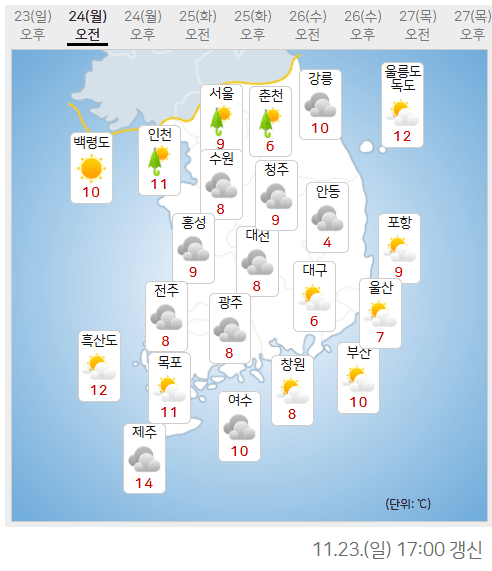 모레(25일)에는 늦은 새벽 3시부터 수도권, 강원영서, 충청권, 전라권, 제주도, 오전 6시부터 경상권, 낮 12시부터 강원동해안에 비가 내릴 것으로 예보됐다. 주요 지역별 예상 강수량은 수도권, 강원도, 전라권, 충청권, 제주도에서 5mm~10mm, 경상권(대구·경북, 부산·울산·경남)은 5mm 안팎, 울릉도와 독도는 5mm~10mm 등이다.