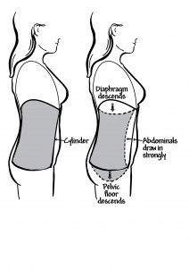 왼쪽 그림처럼 척추 앞의 빈 공간에서 척추를 지지하는 데 도움을 줄 수 있는 역할을 바로 이 호흡을 통해 만들어야 합니다. 그래서 발살바 호흡처럼 배를 부풀리며 호흡을 크게 들이마신 뒤 이를 참고 배 안에 단단한 압력을 유지하는 것을 브레이싱(Bracing) 이라고 칭합니다. 만약 호흡을 흉곽으로 하고 배를 그저 쏙 당겨 집어넣게 되면 모양이 전혀 달라집니다.
