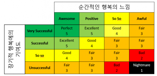 우선 목표를 손에 잡히는 구체적인 지표로 표현하자. 목표가 지표화되면 뜬구름 잡는듯한 목표가 손에 잡힐 듯 다가오면서 성공 가능성이 커진다. 체중이나 허리둘레만 지표화할 수 있다고 믿는 분들은 행복도, 생산성, 글쓰기 등에 대한 다양한 지표화 사례를 참고하도록 하자. 아래는 필자가 2012년부터 사용해 온 행복도 측정의 기준이다. 순간적인 느낌과 장기적인 행복에의 기여도를 결합하여 1부터 5까지의 행복도가 산출되는 것이다.