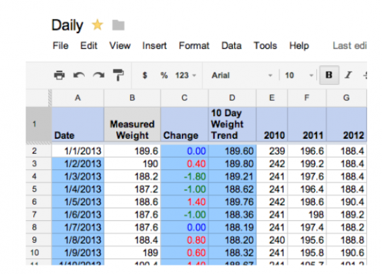 목표를 지표화했다면 현재 자신이 어디 있는지를 파악해야 한다. 아무리 좋은 지도가 있더라도, 자신의 현재 위치를 파악할 수 없다면 목표를 세우는 데 사용할 수 없을 것이기 때문이다. 지표의 유형에 따라 현재 상황을 정확히 파악하는 것 자체가 도전일 수 있다. 체중과 같이 변화가 심한 지표의 경우 위에서 설명한 대로 여러 번 측정하여 얻은 평균값을 사용하도록 하자. 아래는 필자가 예전에 미디엄에서 접한 몸무게 기록표다.