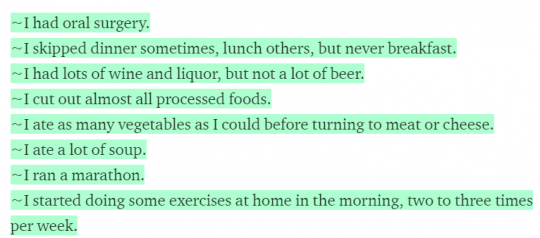 하지만 어떤 습관이 목표 달성에 가장 도움을 주는지 파악하는 것은 쉬운 일이 아니다. 다행히 수치화된 목표와 현재 상태를 정확히 측정할 방법이 있다면 목표 달성을 위한 다양한 대안을 비교하여, 이중 최적의 대안을 실천하면 될 것이다. 위에서 소개한 체중 감량 사례의 주인공은 다음과 같은 다양한 다이어트 방법을 실험한 후에, 자신에게 가장 맞는 방법은 가공 식품을 줄이는 것이었다고 밝히고 있다. 물론 이를 가능하게 한 것은 꾸준히 기록한 몸무게 기록표였다.