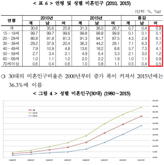 최근 통계청에서 발표한 “2015 인구주택총조사 표본 집계 결과”는 대단히 흥미로운 결과를 담고 있다. 종교인구의 급감이라던가, 대학 졸업인구의 비중이 2010년 32%에서 2015년 38%로 증가하는 등 재미있는 통계가 많았지만, 필자의 관심을 가장 집중시킨 것은 '미혼인구' 비중의 비약적인 증가였다.
