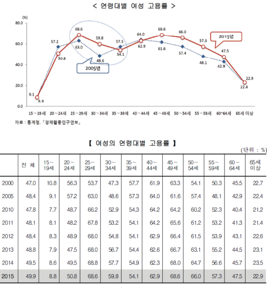 한국의 고학력 여성이 결혼을 기피하는 진정한 이유는 결국 ‘결혼에 따른 경력 단절’ 현상에 대한 우려가 자리 잡고 있는 것으로 판단된다. 실제로 한국 기혼여성의 고용률 통계를 살펴보면, 6세 이하의 자녀를 둔 여자의 고용률은 43.9%로 남자(96.0%)의 절반에도 미치지 못한다. 반면 자녀의 나이가 7~12세로 상승하면, 기혼여성의 고용률은 60.5%까지 상승해 여성의 ‘경력단절’이 대부분 출산과 육아 부담에서 비롯되는 것을 알 수 있다.